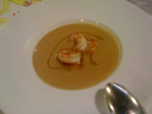 INGREDIENTI: Ceci secchi o in scatola, 1 scalogno, 1/2 patata, brodo vegetale, gamberi freschi, olio evo, mezzo bicchierino di Calvados, sale affumicato