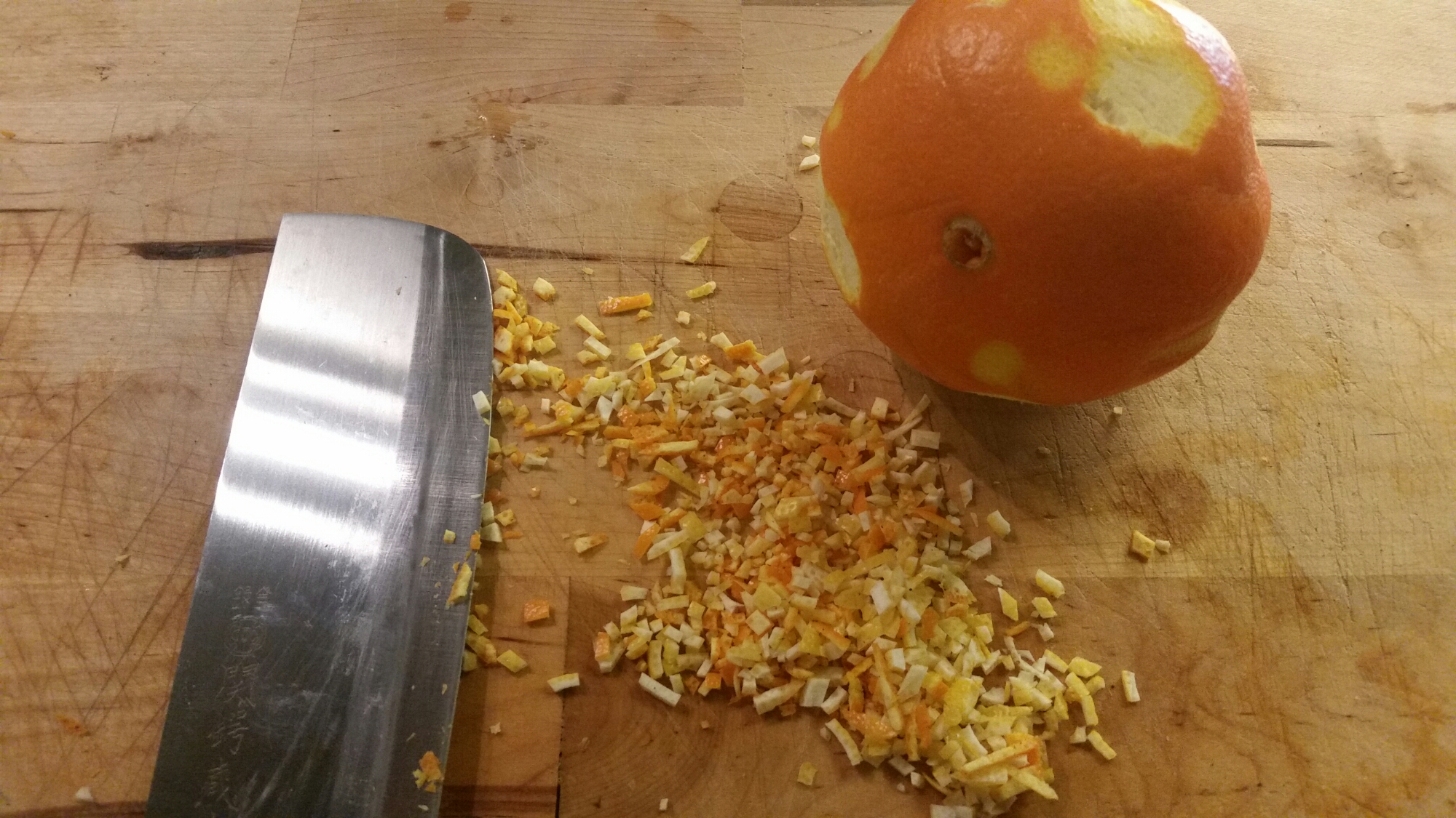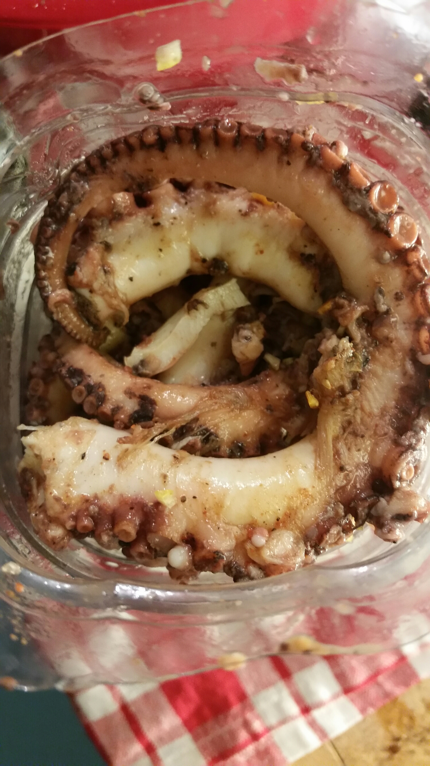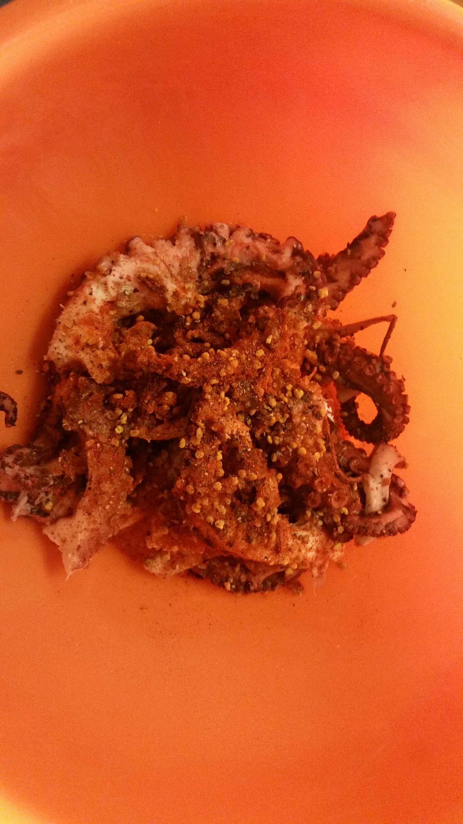 Per 8 persone servono 4/5 polpi di media grandezza, zeste di limone e arancio, sale affumicato al faggio, pepe nero, worchester, pimienton, aglio in polvere e paprika dolce. Poi ne ho fatto una variante senza zeste, ma con cubetti di arancia pelata al vivo, sale affumicato, pepe nero, mix di peperoncini e aglio in polvere.