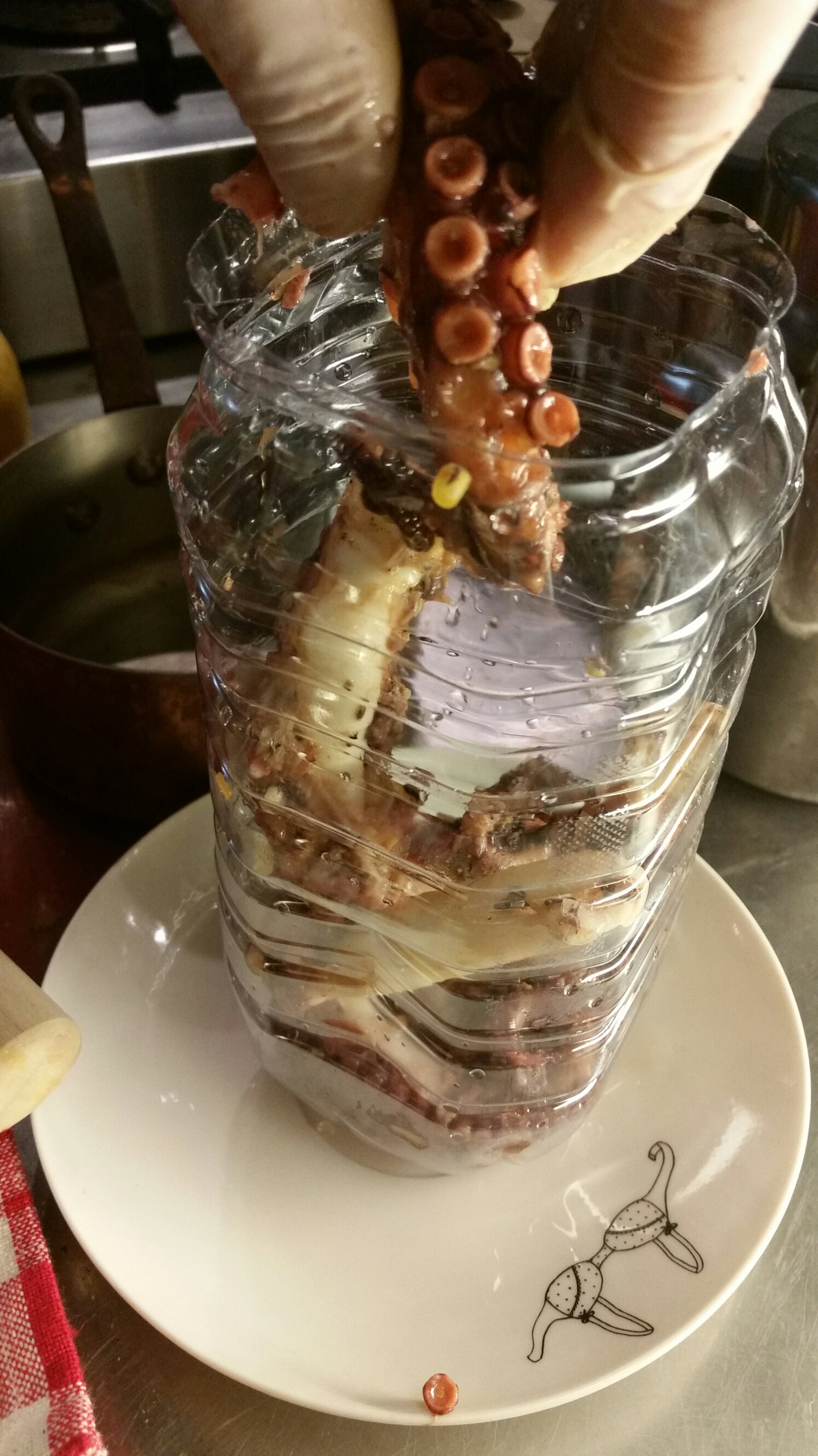 Il polpo va immerso in acqua fredda e portato ebollizione. Tempo di cottura 1 ora. Lascirlo raffreddare nella sua acqua, quindi dividere i tentacoli, rimuovere il becco e pulire la testa. Mescolare il polpo con gli altri ingredienti. Inserire i pezzi on una bottiglia di plastica, precedentemente tagliata a metà e forata sul fondo. Aiutandosi con un peso pressare il polpo nella bottiglia, prestando attenzione ai succhi che fuorusciranno dal fondo forato. Coprire con pellicola e far riposare in forno per almeno 6 ore. Una volta rappreso, tagliare la bottiglia e affettare il carpaccio sottile (meglio se con un’affettatrice).