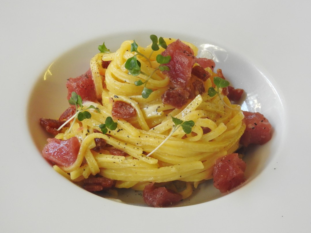 Ingredienti: pasta fresca, uova freschissime, tonno affumicato e tonno fresco a dadini. Sale, pepe e il gioco è fatto. Il segreto è abbianare il tonno in due modi diversi. L’affumicato e il crudo aggiunto all’ultimo per creare una sfumatura di gusto e consistenze diversi, dal più deciso dell’affumicato al delicato del crudo. Una variante più delicata, ma altrettanto sfiziosa, del tradizionale piatto romano.
