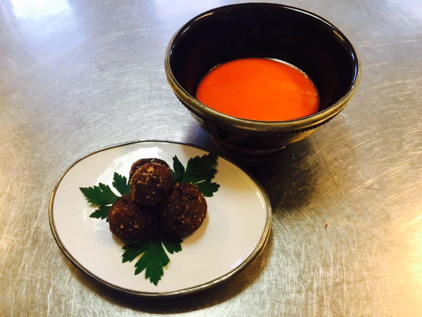 Croccante di melanzana, con vellutata di peperone affumicato. Parto da una mousse di melanzana, profumata con finocchietto del nostro orto, ottenuta con cottura al forno. Le polpette vengono passate in polvere di tarallo e poi rese croccanti in forno, senza friggerle, in modo che restino leggere, ma dal cuore morbido. La vellutata può essere consumata anche come variante del gazpacho o come salsa per insaporire le polpettine croccanti. Mangiare così diventa un gioco. Il cliente sceglie la propria modalità di consumo preferita, con cucchiaio o con le mani.