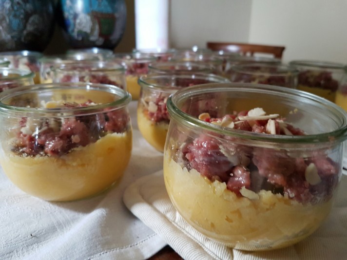Ogni tanto qualche cena la cucino anche per me e per gli amici. -2 giorni a Natale, una serata informale con gli amici diventa anche l’occasione per pensare a una ricetta invernale, con ingredienti della tradizione, ma un po’ reinventato. È nata così la mia ricetta della polentina con ragù di cotechino e funghi. Una semplice polentina gialla, tenuta un po’ lenta e senza sale, dei porcini in padella, lenticchie di Castelluccio, insaporite con scalogno, carota e sedano e ragù di cotechino modenese. Per la composizione del piatto o scelto un vaso di vetro e ho stratificato gli ingredienti, mettendo la polenta in basso, poi i funghi, le lenticchie e infine il cotechino. Ho completato con petali di mandorle croccanti.