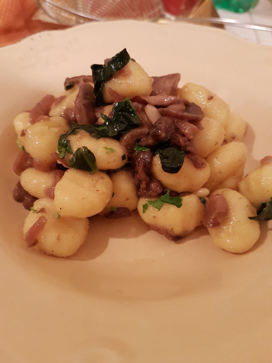 Pranzo della domenica, una delle ultime casalinghe, con la bella stagione alle porte. Gnocchi saltati con porcini, spinaci freschi e pinoli. Preferisco gnocchi fatti in casa o comunque del pastaio. Si procede cosi. Stufare mezza cipolla e appassire i funghi fino ad abbrustolirli e ottenere una consistenza carnosa Aggiungere all’ultimo spinaci freschi tagliati e pinoli. Saltare gli gnocchi cotti in abbondante acqua salata e mantecarli con una noce di burro leggermente salato.
