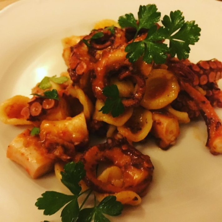 Ricetta non solo estiva con le orecchiette fresche, il polpo e la salsa di pomodoro ciliegino, coltivato nel mio terreno in Puglia. Il polpo è stato cotto e lasciato riposare nella sua acqua, fino a raffreddamento. È stato poi grigliato su una piastra e condito con sale, pepe, olio e pimienton. L’ho quindi lasciato a insaporire in frigo per una notte coperto con la pellicola. Per la salsa ho usato quella di mia produzione a brand 02, fatta, artigianalmente, con pomodorini ciliegini ben maturati al sole e poi cotti, brevemente, con aglio e olio 02. Infine vengono passati nel passaverdure e la salsa ottenuta è stata condita con sale e origano biologico. Per completare la ricetta, lessare la pasta fresca al dente, in abbondante acqua salata, condire con la salsa, fatta sobbollire e aggiungere il polpo tagliato in tocchetti.
