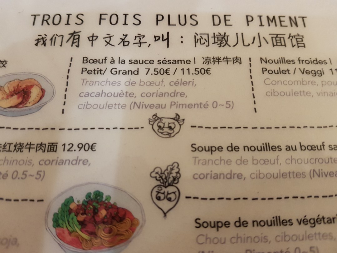 E’ a Parigi, in rue Saint Martin uno dei migliori bistrot cinesi, in cui abbia mai cenato. Il nome è tutto un programma: Trois fois plus de piment. Piccantezza allo stato puro e coda spaventosa per entrare. Il posto è piccolo, con 10/12 micro tavolini e il menù altrettanto mini. Servono ravioli, noodles, asciutti o in brodo in 3 varianti, con peanuts, aglio, peperoncino e varie altre spezie, in perfetta armonia di dolce e salato. Valeva tutti i 30 minuti di coda, al freddo e sotto una pioggerellina da tortura cinese. Basta entrare per essere invasi da profumi intensi che ti farebbero ordinare l’intero menù.