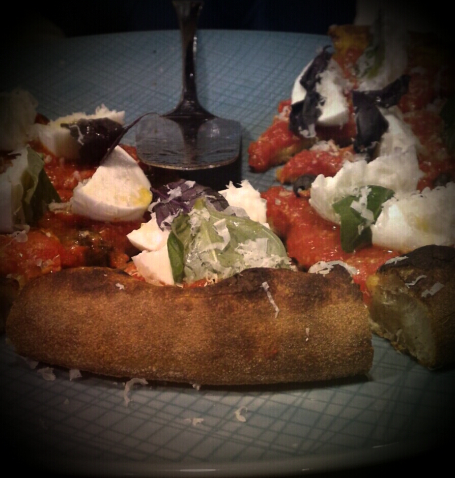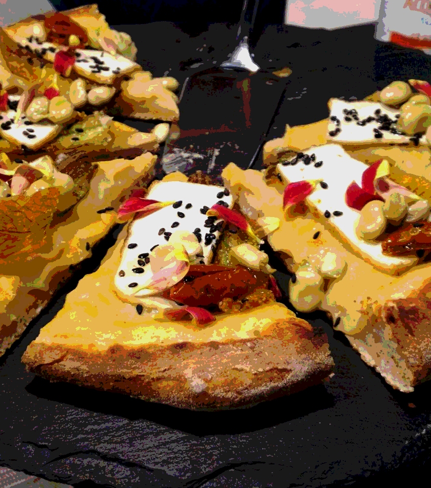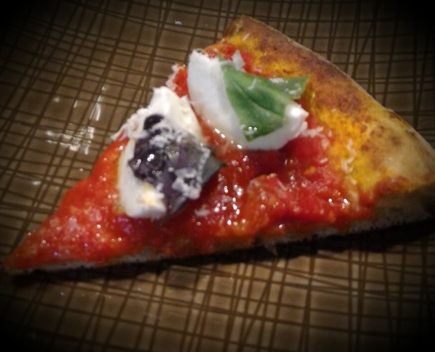 La pizza. L’impasto è realizzato con lievito madre, sempre con qualche peculiarità. La margherita è al basilico, la vegana è integrale. La pasta è ben cotta, lievitata, croccante e dorata. Viene servita tagliata in 8 fette, una per volta, con l’idea di condividerla con i propri commensali e di consumarla ben calda. Nessuna pizza è banale e gli ingredienti di alta qualità con accostamenti inattesi. La più semplice è una squisita margherita con pomodoro denso, corposo e saporito, bocconcini di bufala a crudo, parmigiano e basilico verde e rosso. Pomodoro da urlo.
