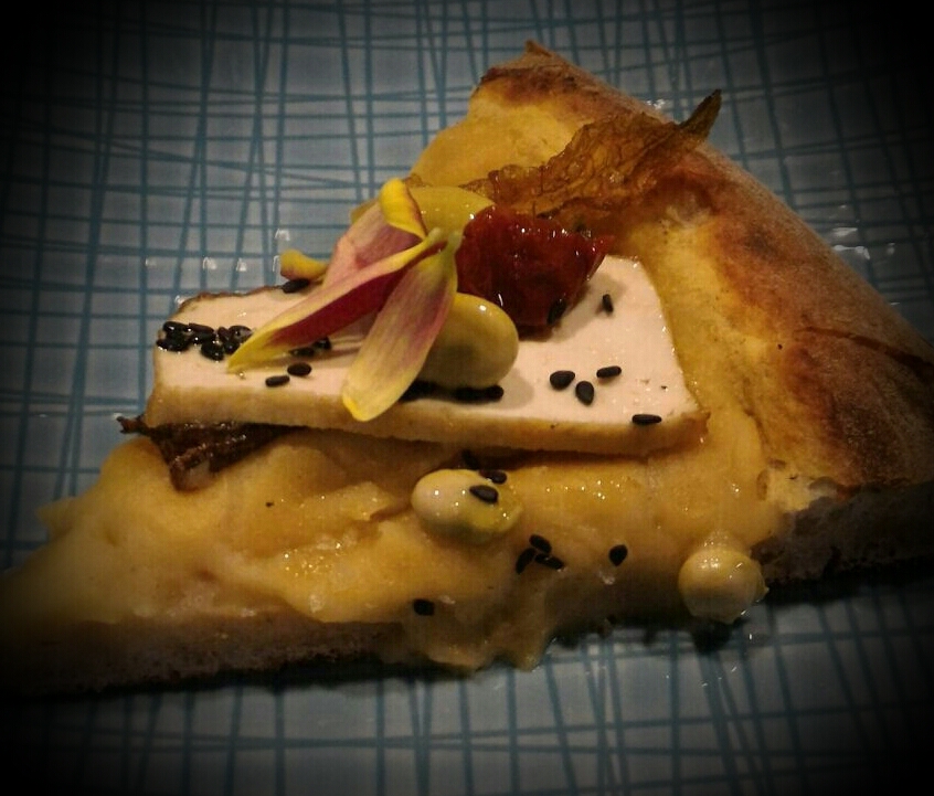 Abbiamo assaggiato anche una vegana integrale, con crema di fave e favette fresche, tofu crudo, pomodorino secco, foglia di menta fritta e fiori edibili. Insolita, molto delicata e ed esteticamente appagante.