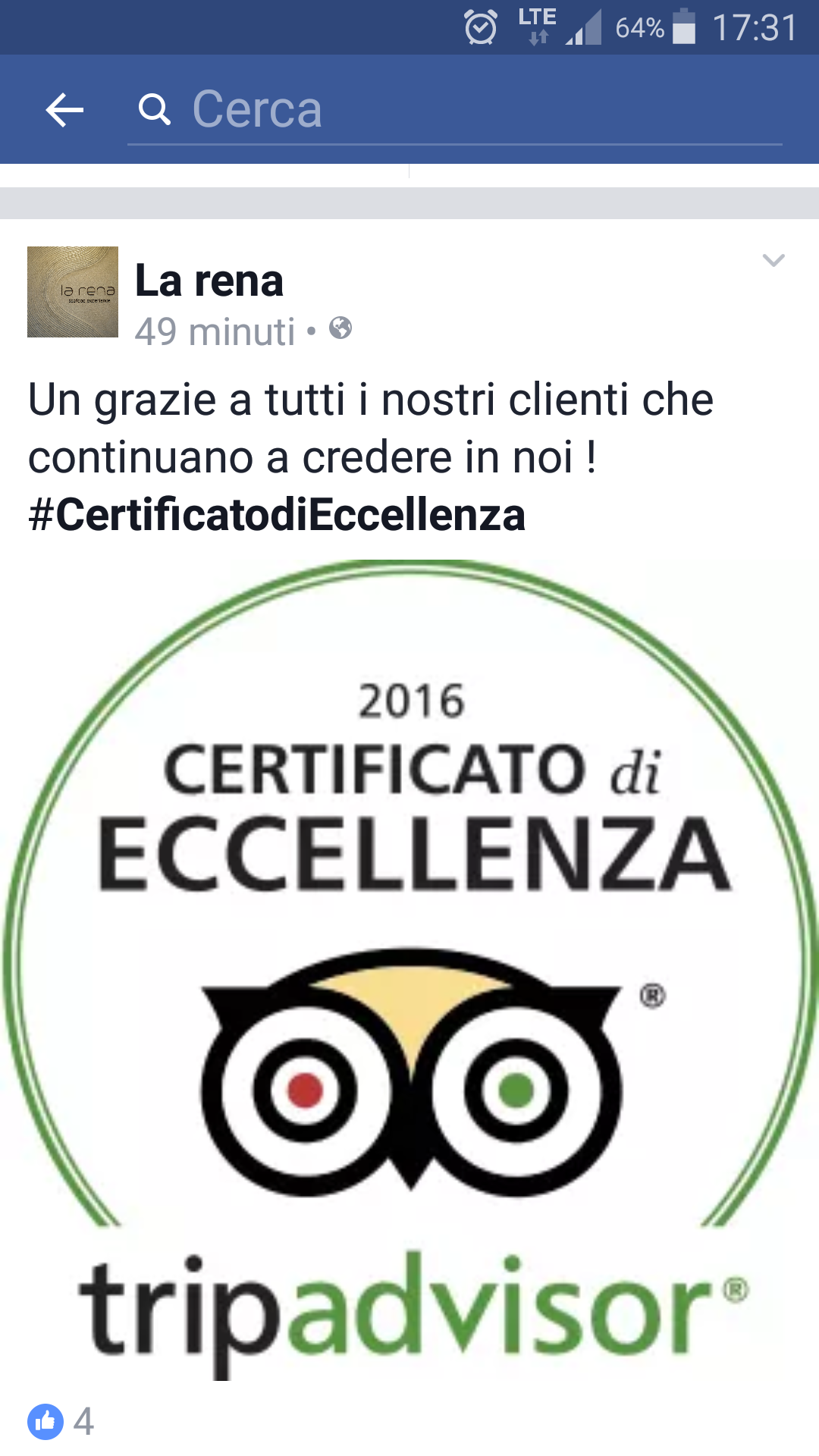 Certificato di eccellenza di TripAdvisor che dura per l’ultimo cliente che ho seguito il ristorante La Rena seafood experience.
