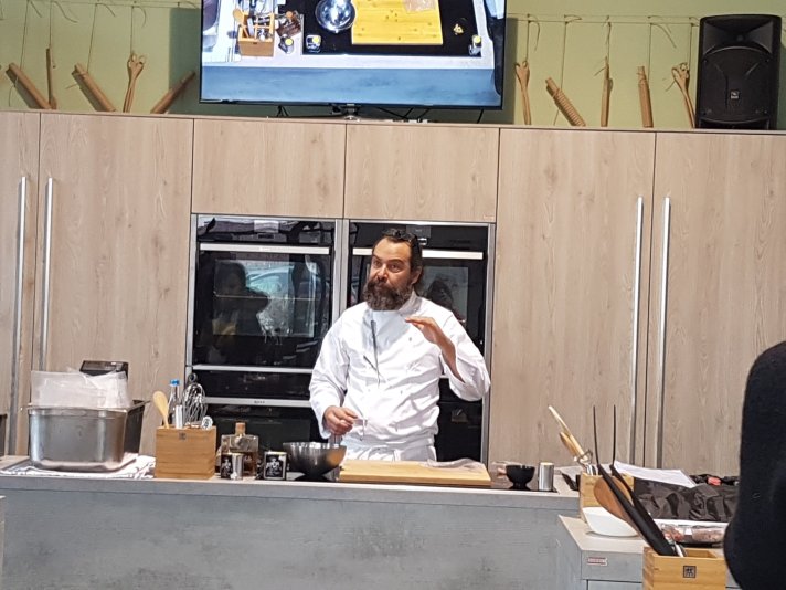 Per la promozione della recente pubblicazione dello studio IL PACKAGING ALLUNGA LA VITA, ho realizzato un allestimento con legumi e cereali, dashi e brodi, utilizzando la tecnica di conservazione per disidratazione degli elementi, che vengono poi confezionati. Allo stand i visitatori possono anche degustare la soup più gradita e possono scegliere la miscela preferita, da portarsi via, in una confezione rigorosamente richiudibile ripetute volte, realizzata dall’azienda Smilesys, che ha vinto quest’anno il premio BEST PACKAGING over all. Smilesys è anche sponsor tecnico, dell’Istituto Italiano Imballaggio in questa manifestazione. Le zuppe sono realizzate per infusione con funghi, piselli, rapanelli, quinoa gialla e nera, lenticchie rosse e soia gialla essiccati. Nel pomeriggio, con la stessa tecnica, offriamo anche miscele personalizzate di tè Sencha e Gunpower, profumati con rose e gelsomini. Interessante per me, in particolare, il dialogo con i visitarori con cui ci si confronta sulle tecnciche di conservazione e sulle prestazioni dei materiali e un po’ anche sulle tecniche di cottura e le proprietà degli elementi.