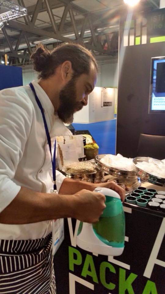 Di nuovo un evento per il packaging. Durante una fiera di settore, altamente tecnologica dedicata al packaging, sono stato incaricato di realizzare una performance che mettesse al centro il food e il rapporto stretto con il packaging. Alla fine, come mi fanno notare, da quando ci svegliamo al mattino, maneggiamo almeno 20 packaging, dal dentifricio, al caffè e siamo appena svegli. Questo tema del packaging mi affascina e mi sta aprendo molte opportunità di crescita e sperimentazione. Ho pensato di incentrare il mio evento live, non tanto sul cucinare dal vivo, quando sui procedimenti che prevedono uso di tecnologie. Ho disidrato frutta, verdura, carne, pesce, insomma un po’ di tutto. Con il cibo essiccato ho allestito il tavolo di lavoro e ho mostrato le varie fasi da prodotto fresco al risultato finale. Con il cibo disidratato ho creato dei preparati per brodi e infusi, che ho confezionato al momento in tissue alimentare. Poi ho imbustato i fagottini di tissue in buste trasparenti, adatte al contatto con gli alimenti e ho messo sottovuoto i prodotto. Le bustine con il cibo essiccato sono diventate gadget per i visitatori dello stand.
