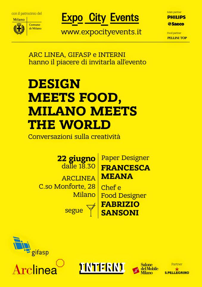 Il prossimo 22 giugno sarò protagonista di un evento Fuori Expo. Fa parte degli incontri organizzati dalla bibbia del Design Interni. Il ciclo di eventi si chiama DESIGN MEETS FOOD, MILANO MEETS THE WORLD. Insieme alla paper designer Francesca Meana, parlerò di design, food e packaging sostenibile, nello show room Arclinea.